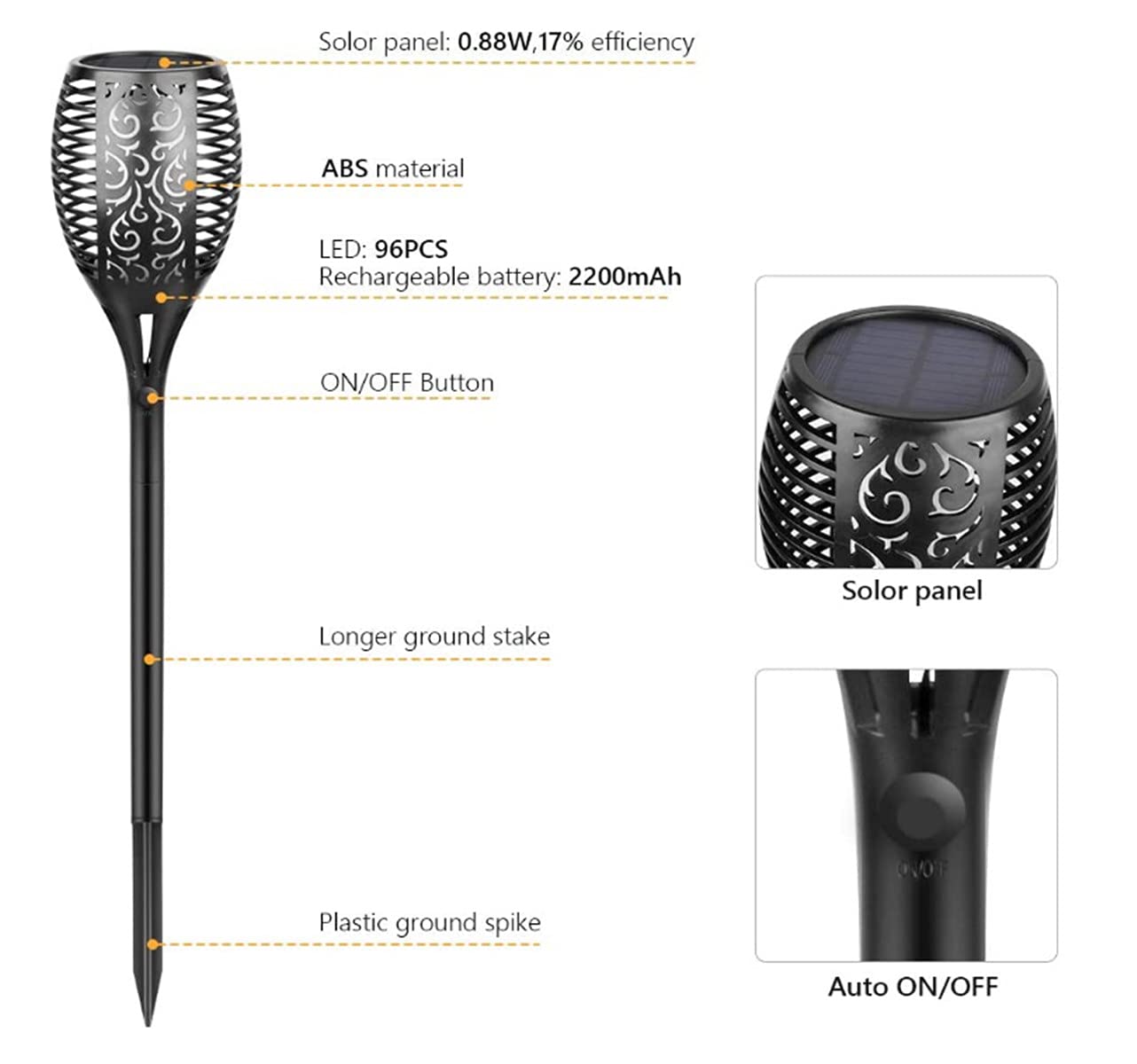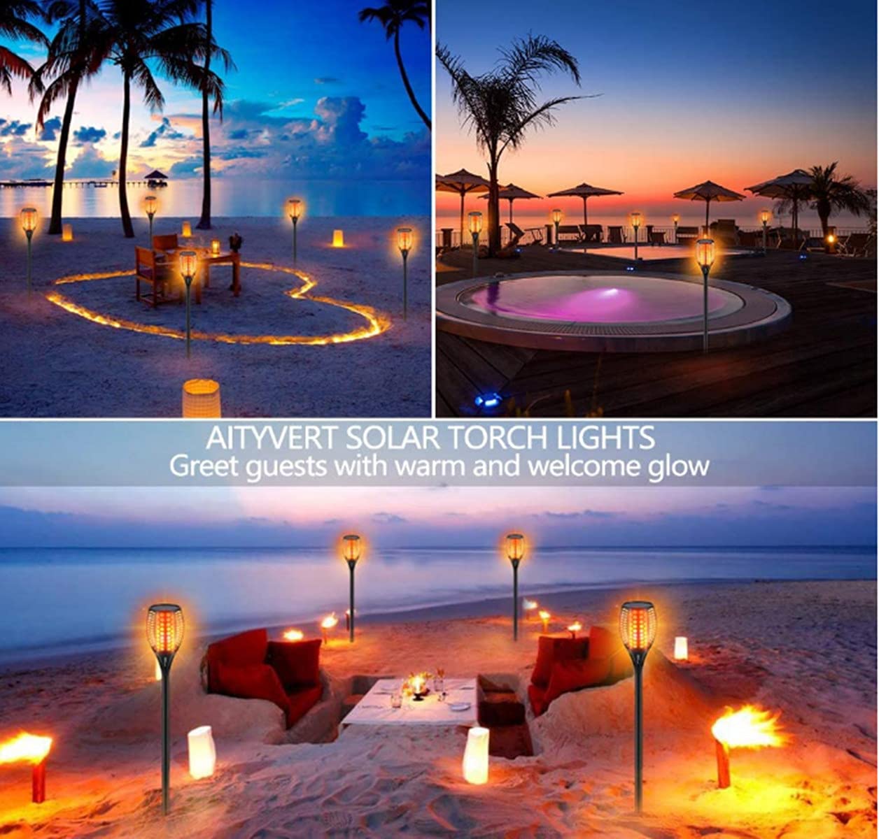 - 【EASY INSTALLATION 】No wiring required, simply install solar flame lights anywhere you like, then enjoying the torch light yourself and greeting guests with warm and welcome glow.pathways, pool, garden, bench, patio, fence, deck, or outdoor events like parties, camping, barbecue, wedding, Christmas, Halloween, Thanksgiving. e torch lights enjoy free replacement or refund during 12 months omise period.