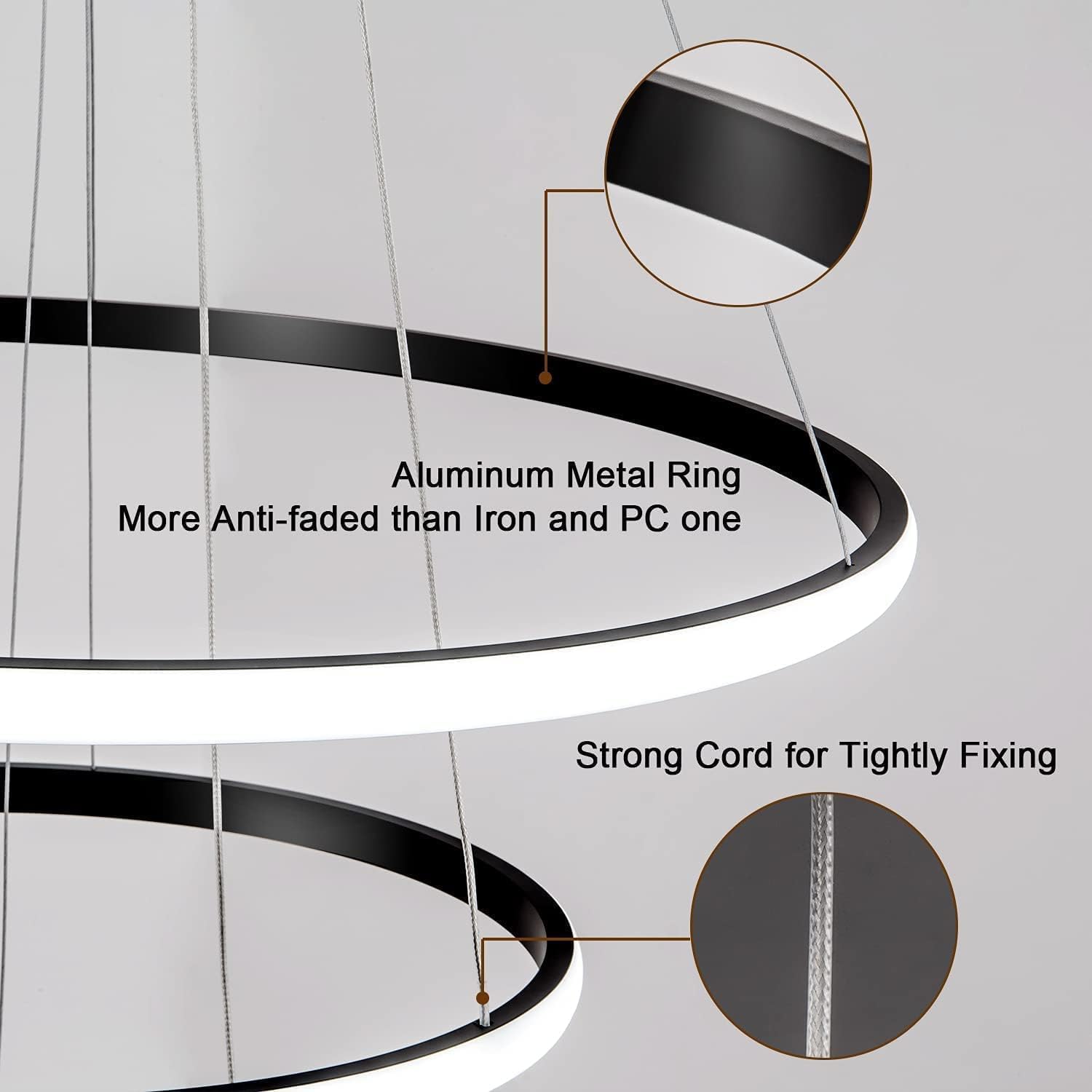 - ✨【Modern Pendant Light Can DIY Shapes】This modern pendant light with adjustable strings via cable locking pin. Before installation, You can DIY favorite shape. The strings of this led chandeliers can be adjustable 39", set a hanging height your want. This 3 rings chandeliers can be adjusted at will, making your lighting decoration timeless. The 3 rings led chandeliers easily adjust the hanging cord, design the shape your favorite.
