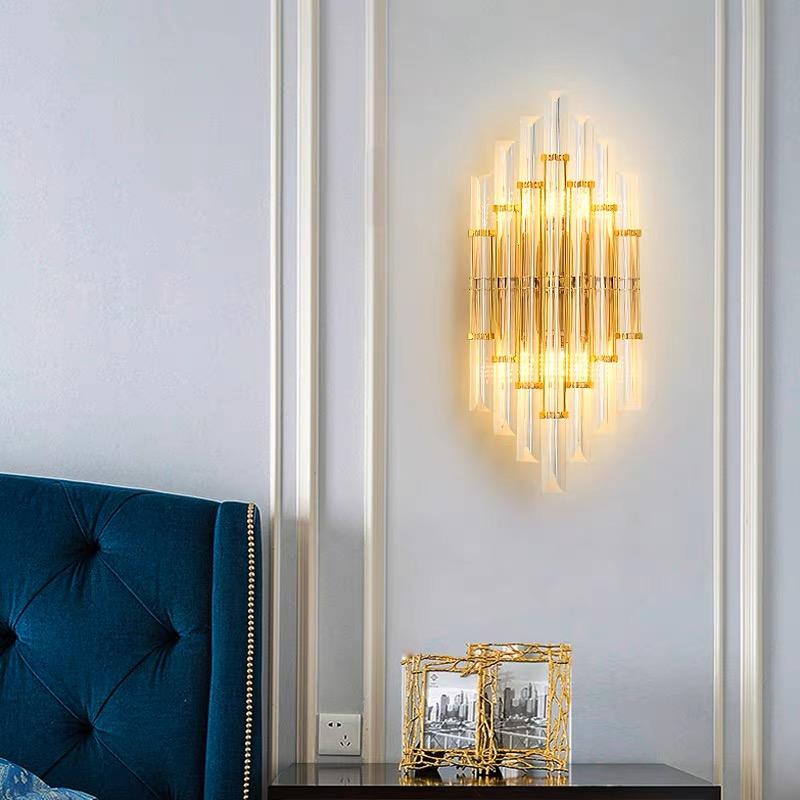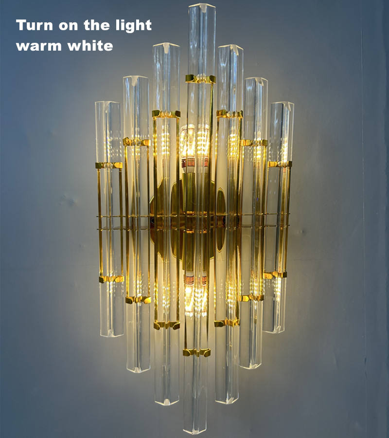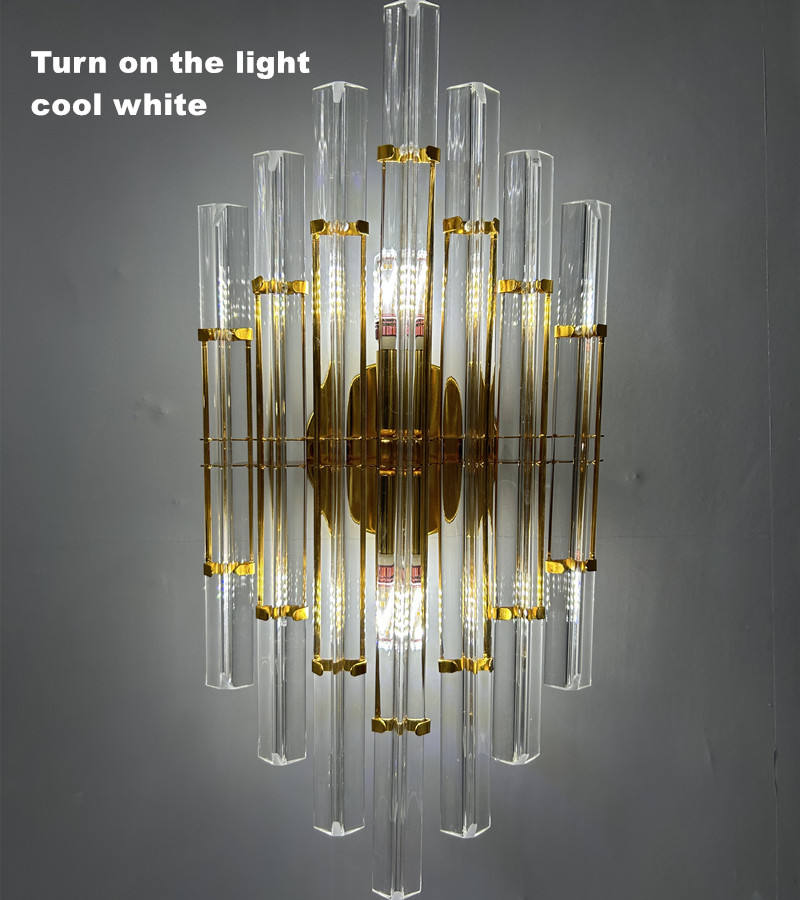 Enhance your living space with the modern new gold wall lamp. The sleek design and crystal glass details add a touch of elegance to any room. Perfect for accenting your living room, bedroom, or bathroom, this wall lamp provides soft and comfortable lighting for a cozy atmosphere.