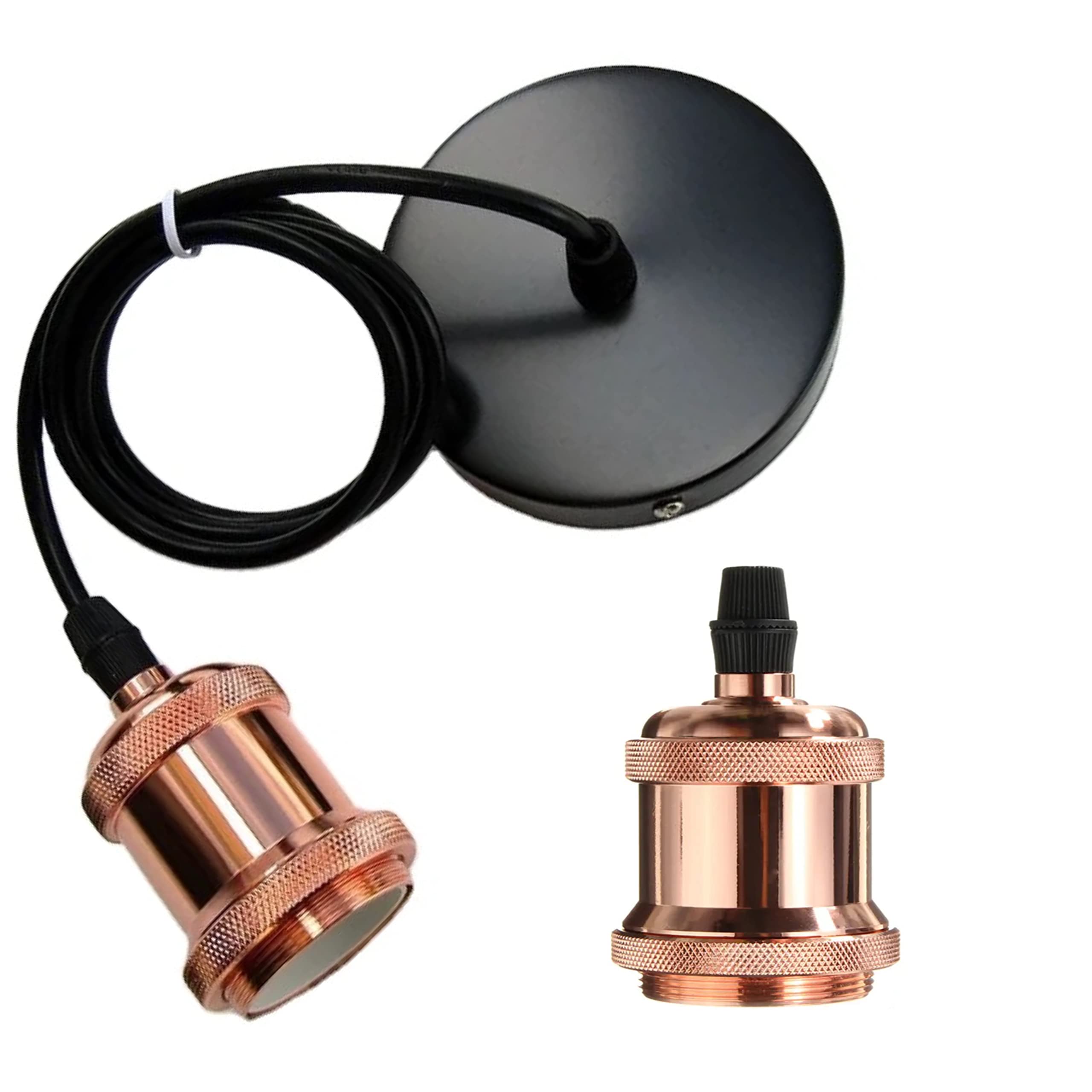 Product Description Decorative cord sets comprising an E27 lamp holder with plated aluminium cover, plated steel ceiling rose with internal terminal block and a 1 nylon braided mains cable, which can be cut to length and re-connected in the ceiling rose as required. Install with vintage style LED filament lamps to create a retro-style lighting scheme. Brushed and antique metal finish 1m nylon braid mains cord Easily cut to length inside ceiling rose Set Contains: Cord set with E27 lamp holder and matching ceiling rose