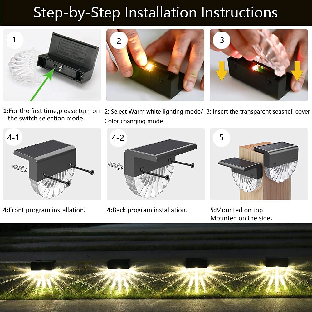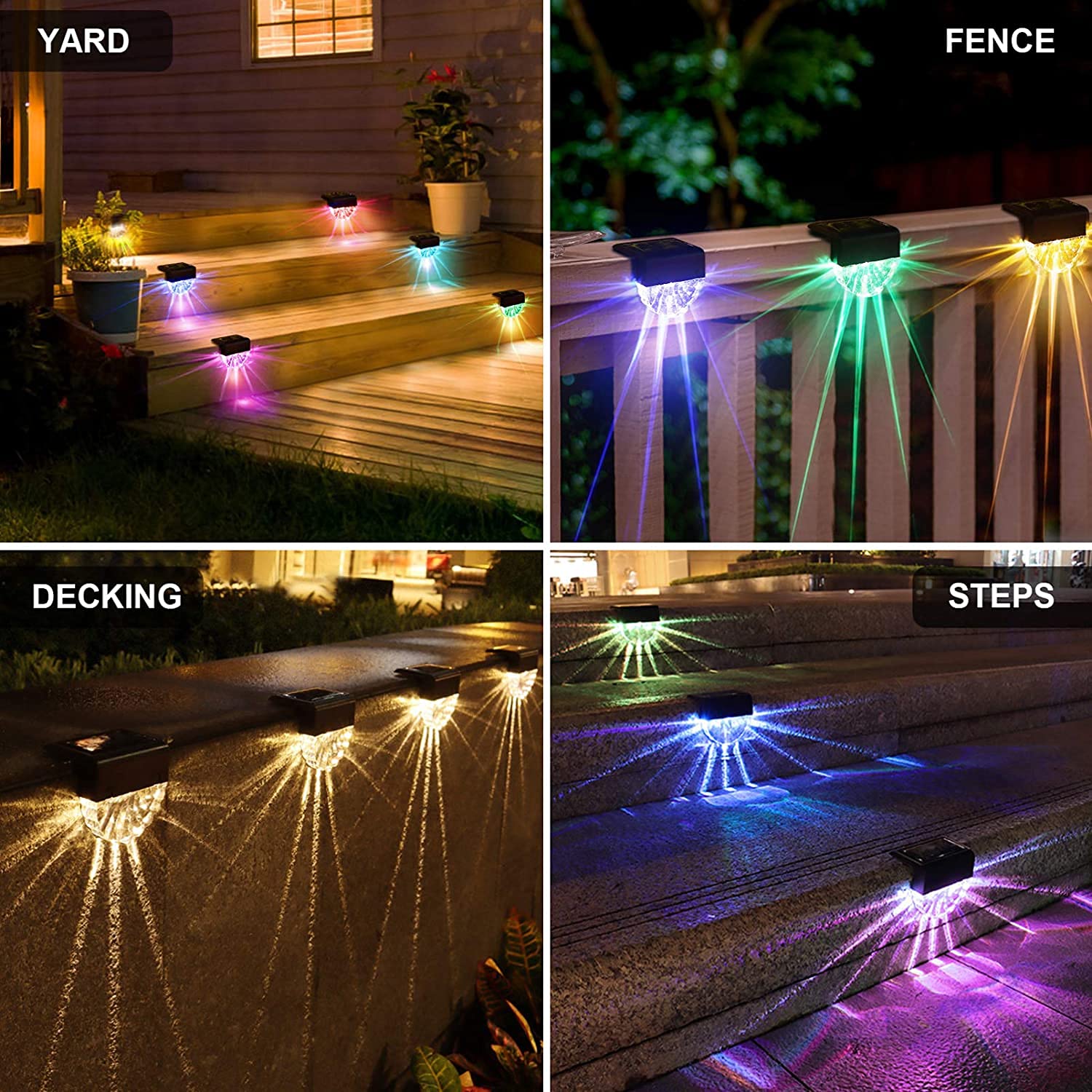 Nextlife Solar Deck Lights Outdoor Solar deck /fence/step/stair lights. The Warm White is suitable for daily decoration, and the other one is especial fit for festival décor. Two adornment modes choice, avoid your adornment worry. Are you willing to create a beautiful atmosphere for your yard at night? There are many different types of solar deck lights to choose from when you want to entertain or host guests outdoors. But why choose DenicMic solar deck lights? Specifications: NI-CD battery: 1.2V 600mAh Solar panel: 2V 0.26W LED Lighting Color: Warm White/Color Changing 2 mode Solar panel charging time: 6 hours Working time: 8 to 9 hours Material: ABS plastic Waterproof: IP65 N.W.: 0.33 lb
