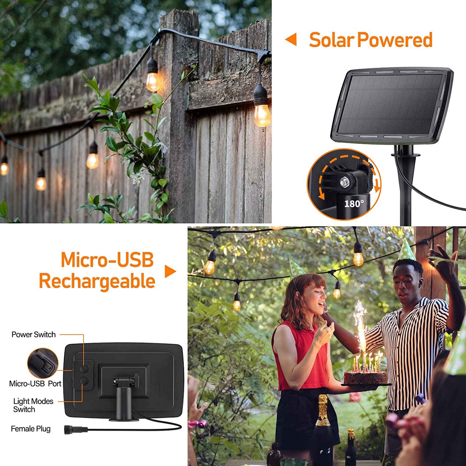 - 【Newly Upgraded Solar Panel & USB Port】: Removable patio string lights will be no limit for any lighting direction, larger monocrystalline panel with built in 2 batteries will enhance the energy conversion rate up to 19.5%, 8-12H running. Only USB charging will be great for cloudy or rainy day, and preventing insufficient solar charging during RV travelling or camping.