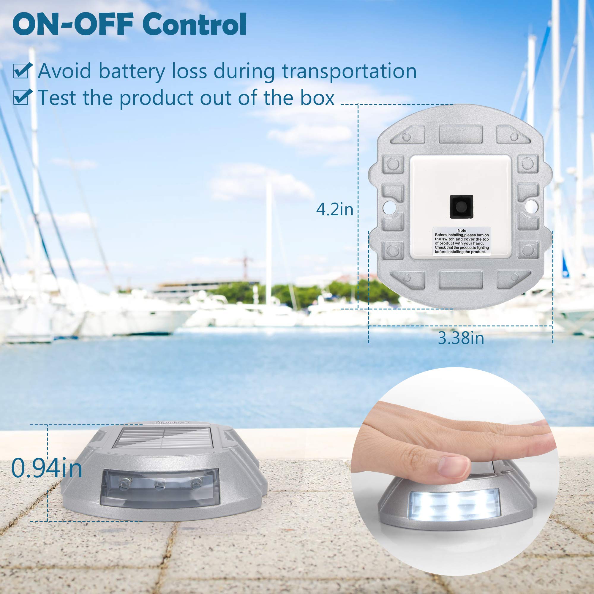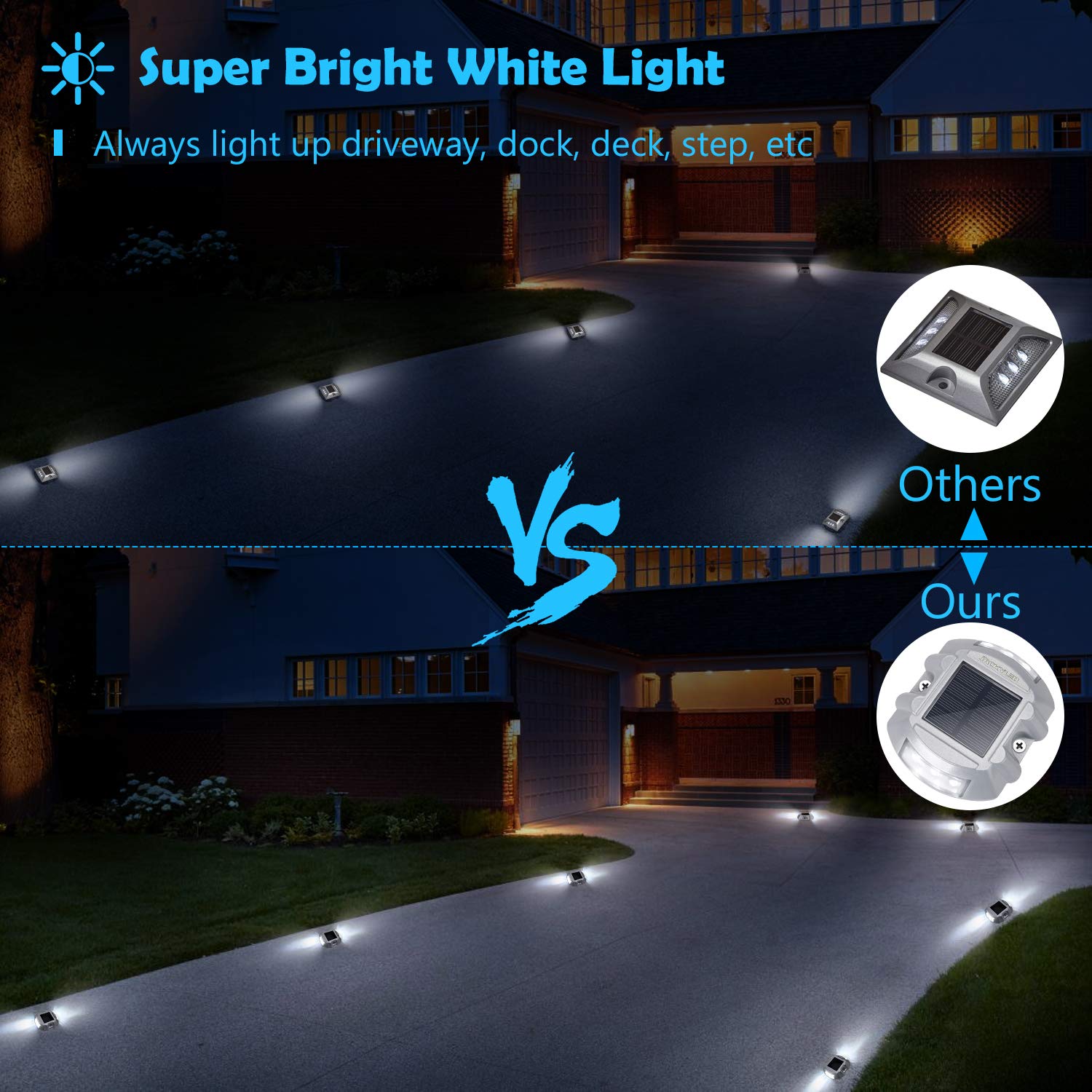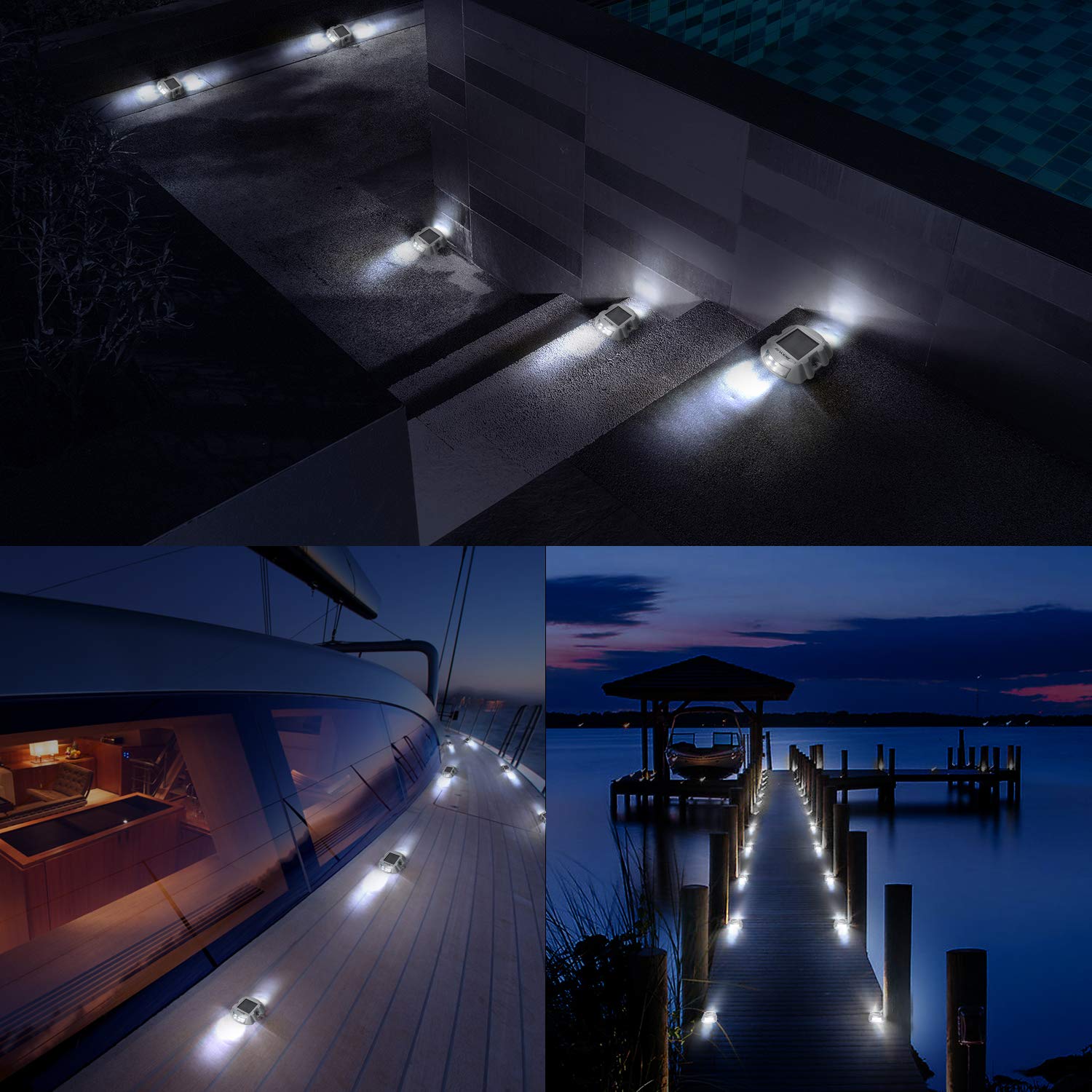 - SUPER BRIGHT LIGHTING: Built-in 6pcs high quality super bright LED light beads, our solar deck lights provides bright white with slightly bluish light for your swimming pool, stairs, etc. Protect you and your families from the falling accident caused by the darkness of night.