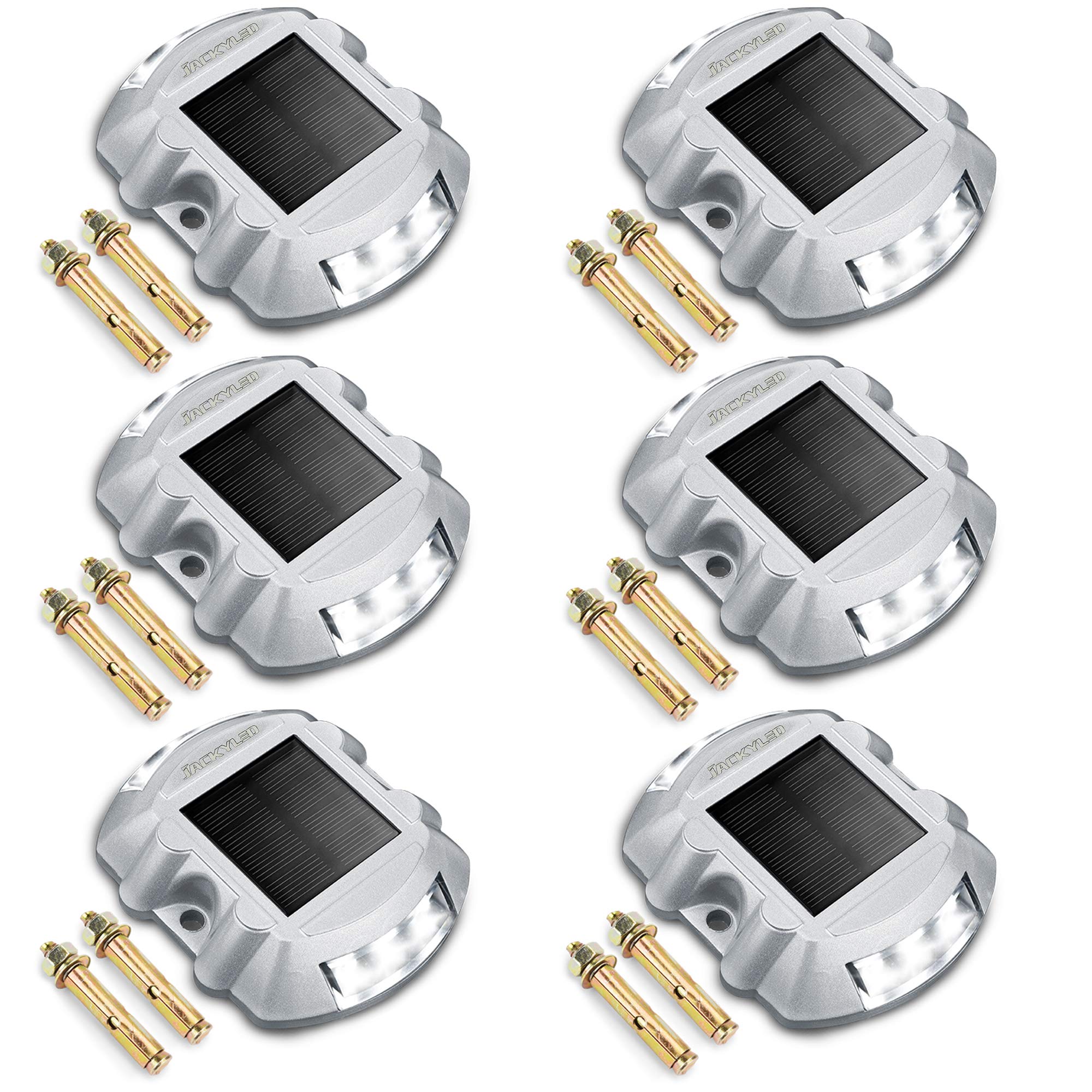JACKYLED solar driveway lights have been upgraded. With the newest solar panel(2V/150MA 0.3W) and 600mAh larger capacity battery, the solar deck lights have shorter charging time(4 hours) and longer working time(6 hours). 6pcs 9LM light beads provide bright light to your garden, pathway, deck, yard, and sidewalk. Protect your families from accidence caused by darkness. IP68 weatherproof and pressure-resistant up to 25 tons, make the solar dock lights more durable. Switch control solves the problem that battery loss caused by being placed for too long. Ideal for your outdoor lighting. Please be assured of using JACKYLED solar pathway lights.
