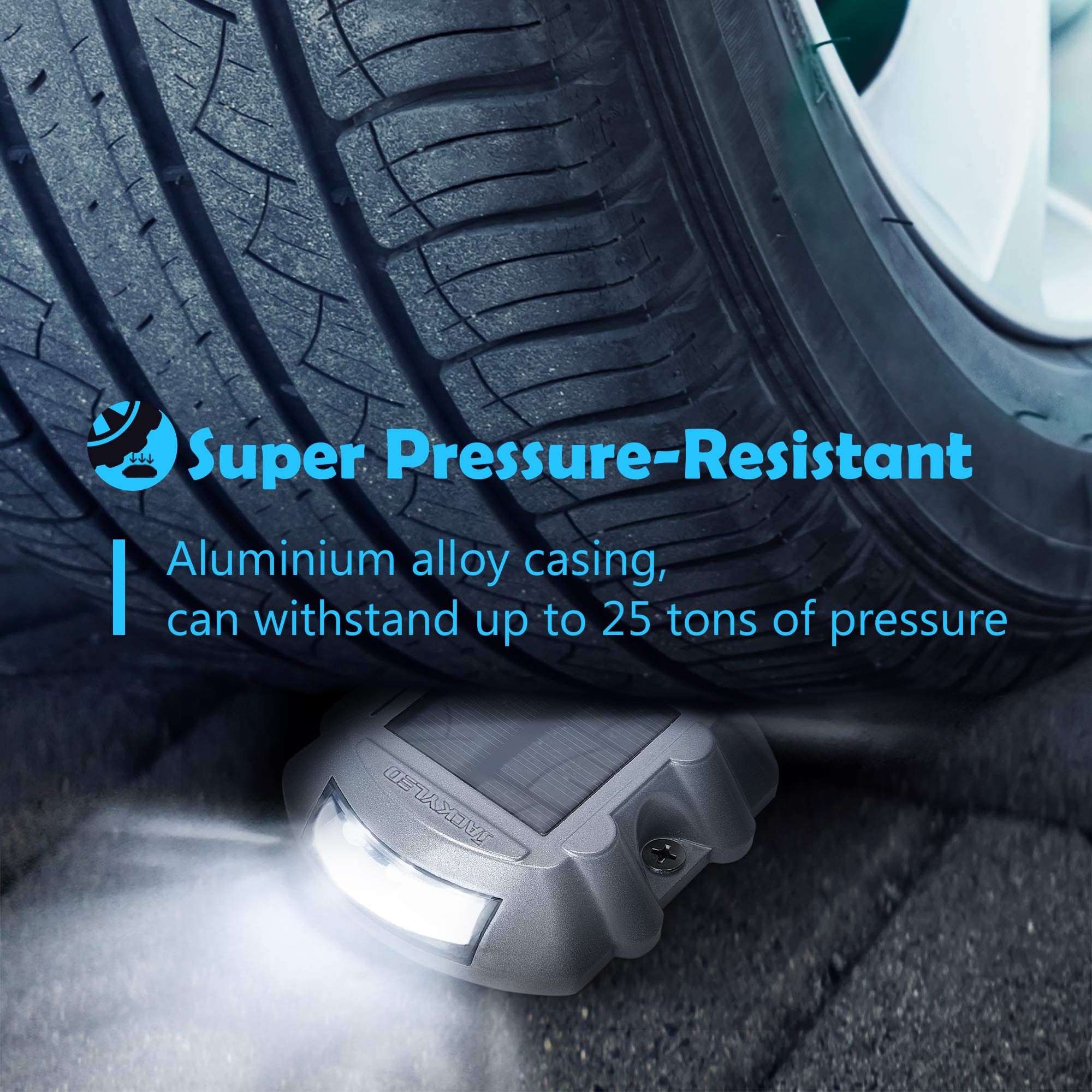 - IP68 WEATHERPROOF & HIGH PRESSURE-RESISTANT: IP68, the highest grade of dust-resistant and water-resistant. Please be assured to use it outdoors without worrying about any bad weather. With aluminum alloy casing, the solar deck lights can withstand 25 tons pressure which has passed the professional compression test. It will not be damaged even the trucks passing through. Durable and ideal for outdoor lighting.