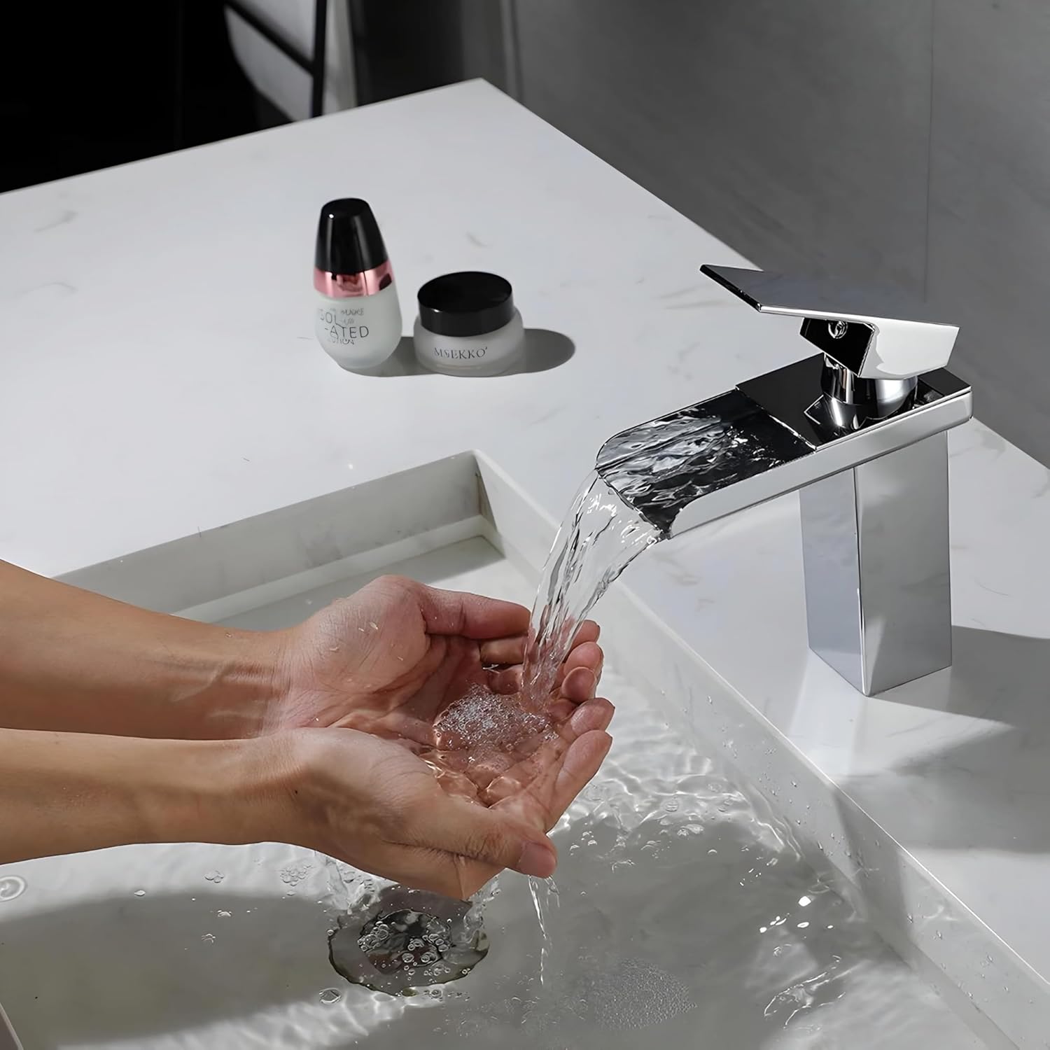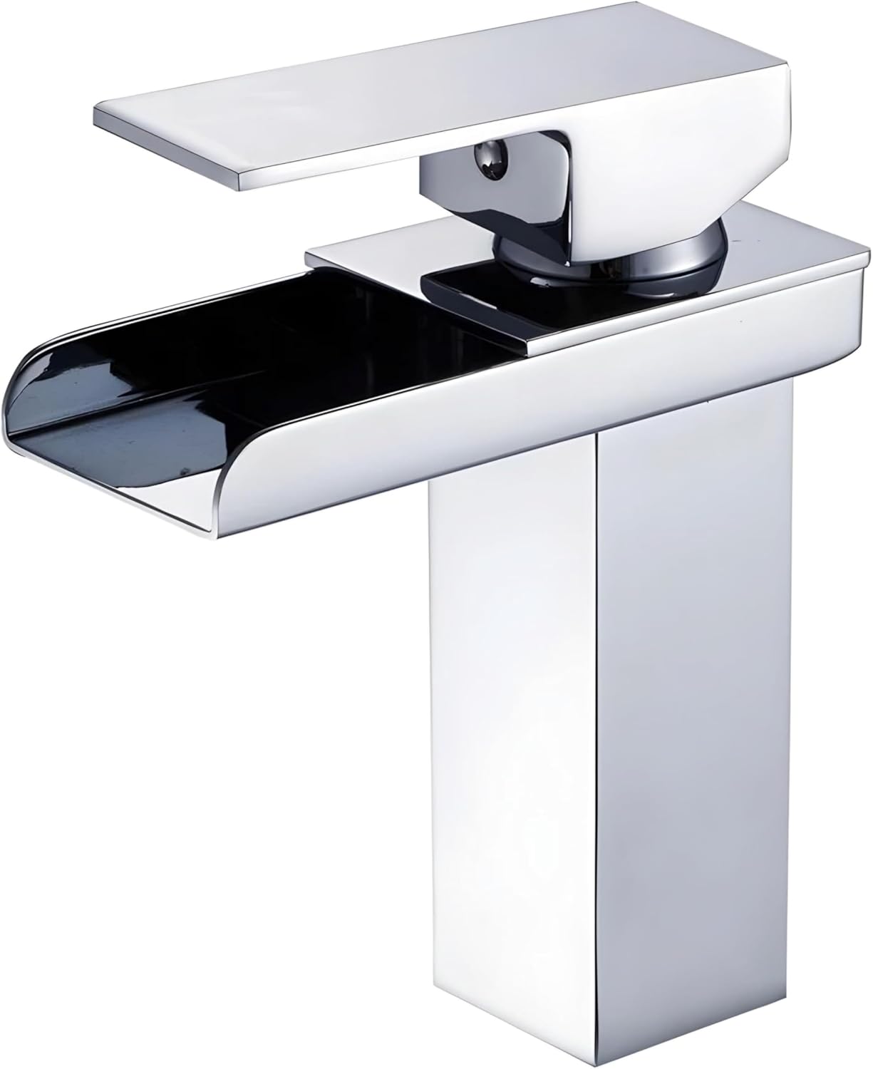 Waterfall Bathroom Basin Mixer Tap, Single Handle, Hot and Cold Water, Short Chrome