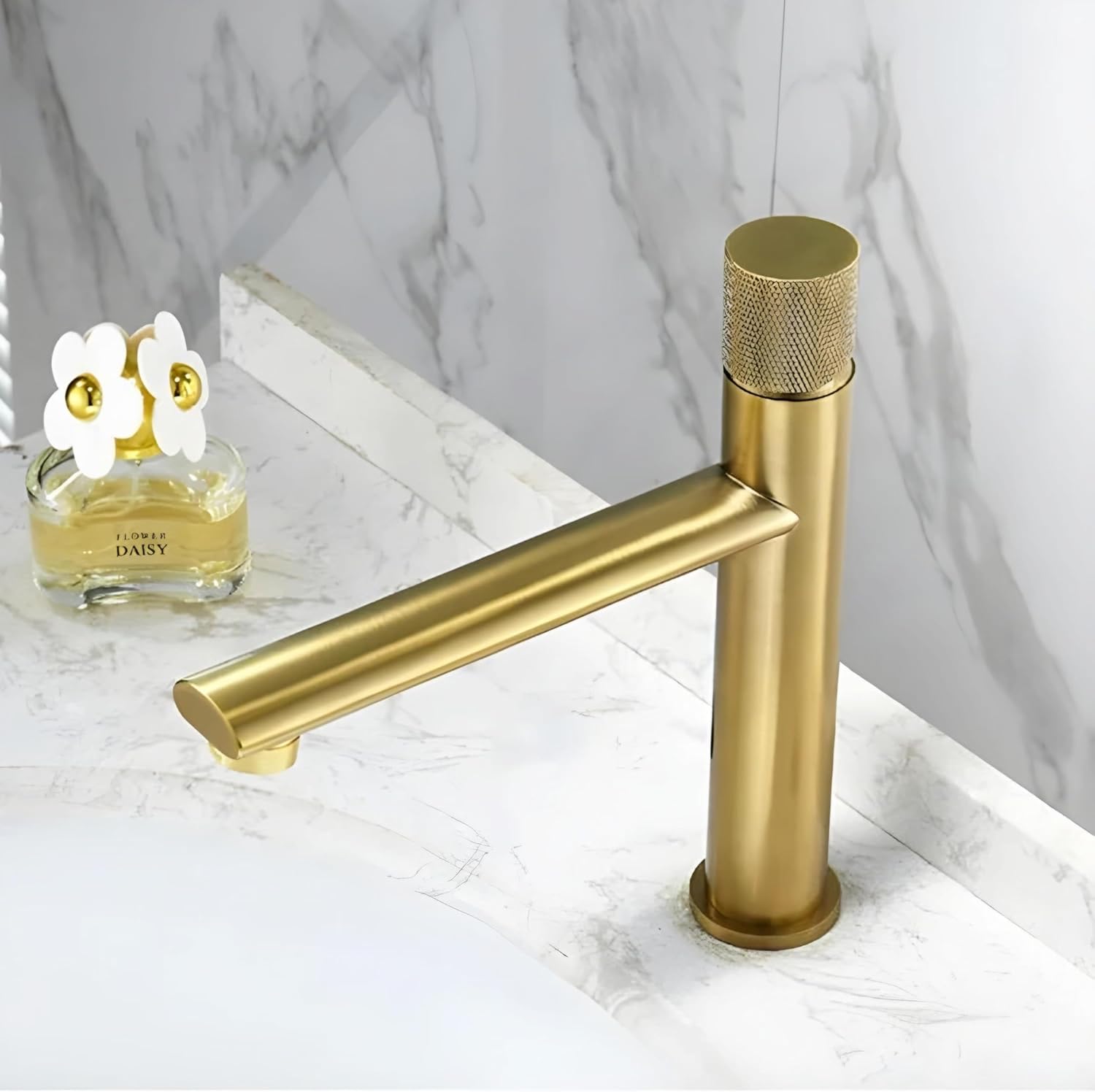 Solid Basin Faucet, Deck Mounted, Single Hole, One Handle, Bathroom Vanity Mixer Tap, Hot and Cold Water, Short Gold
