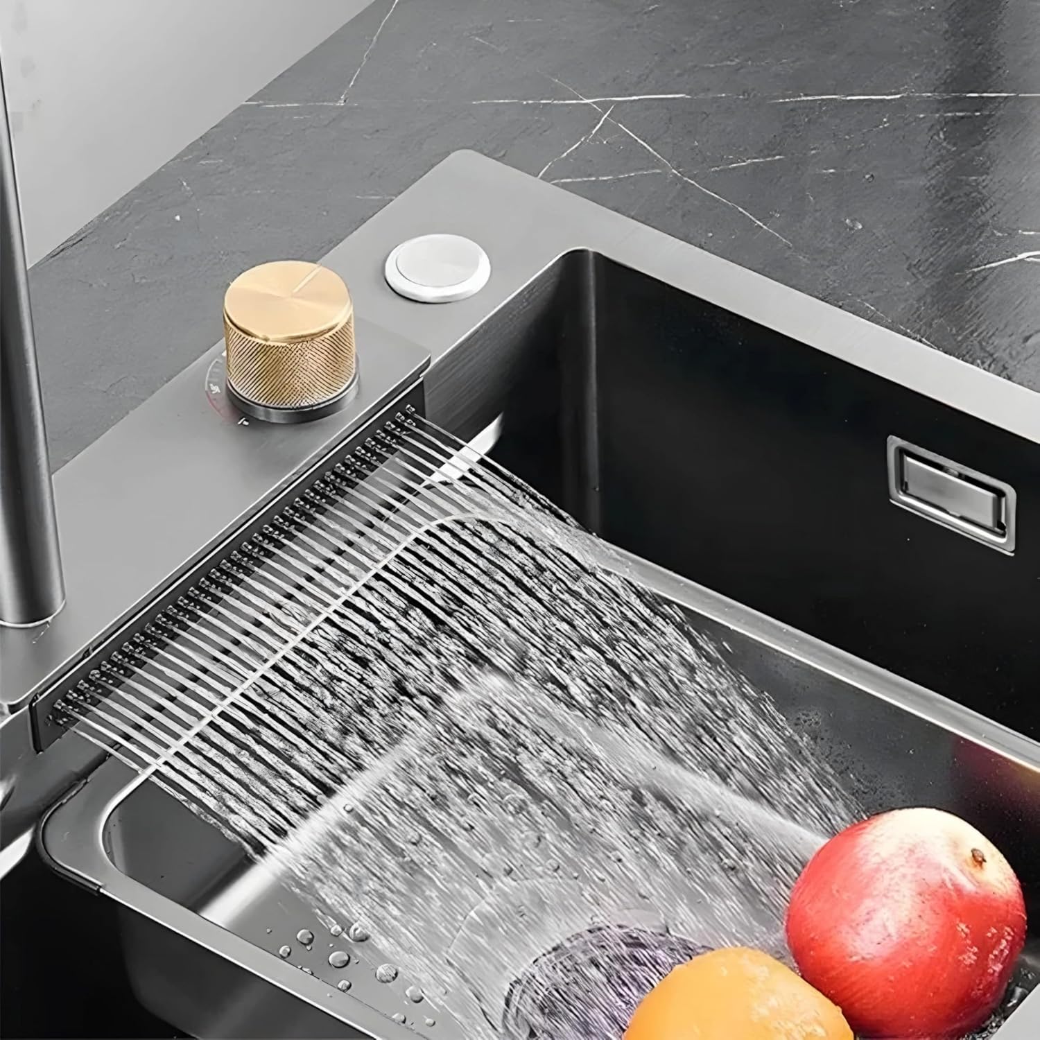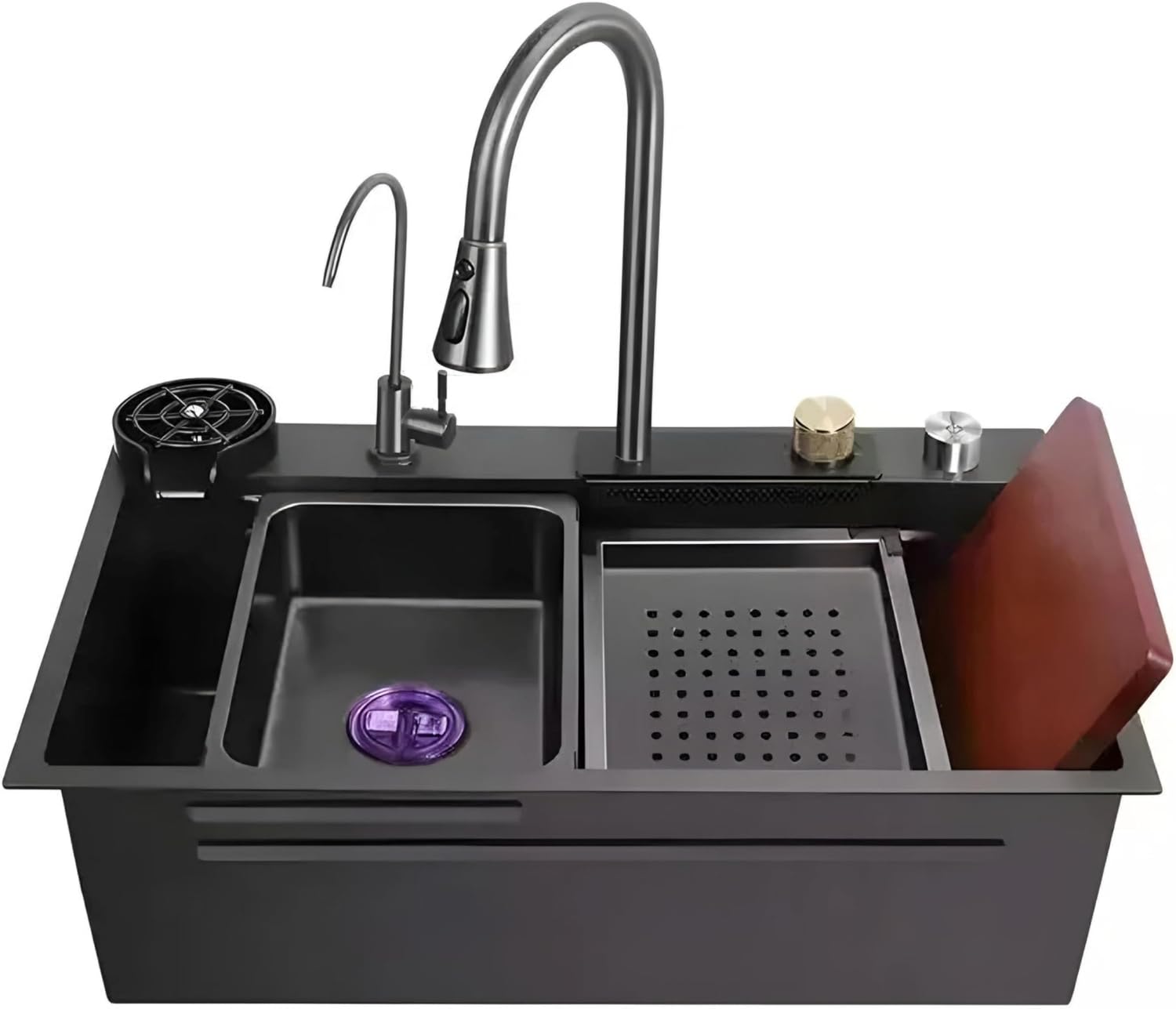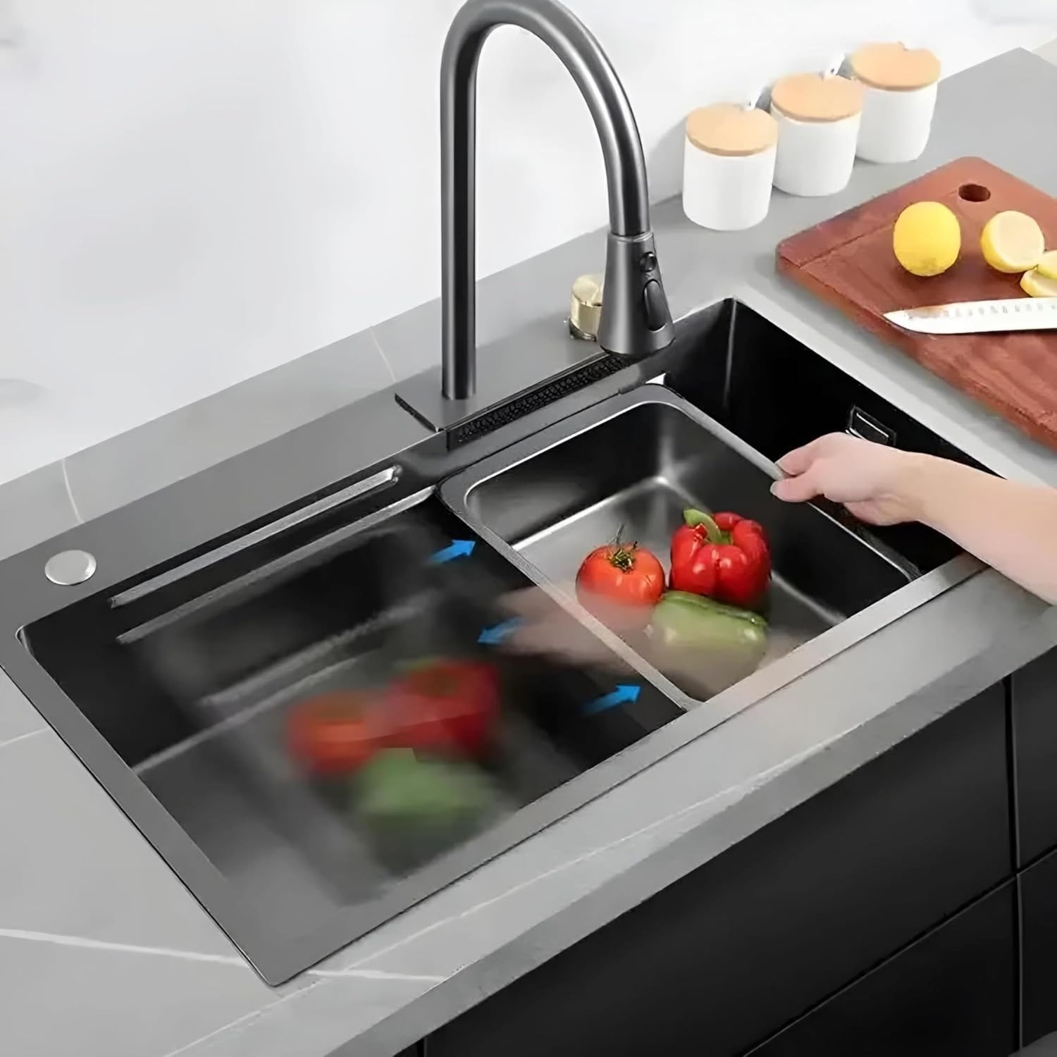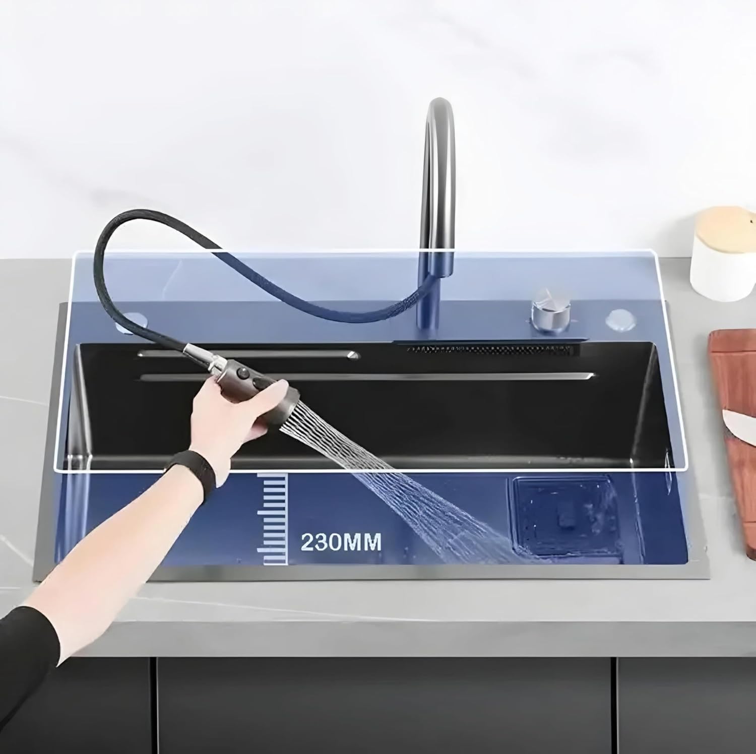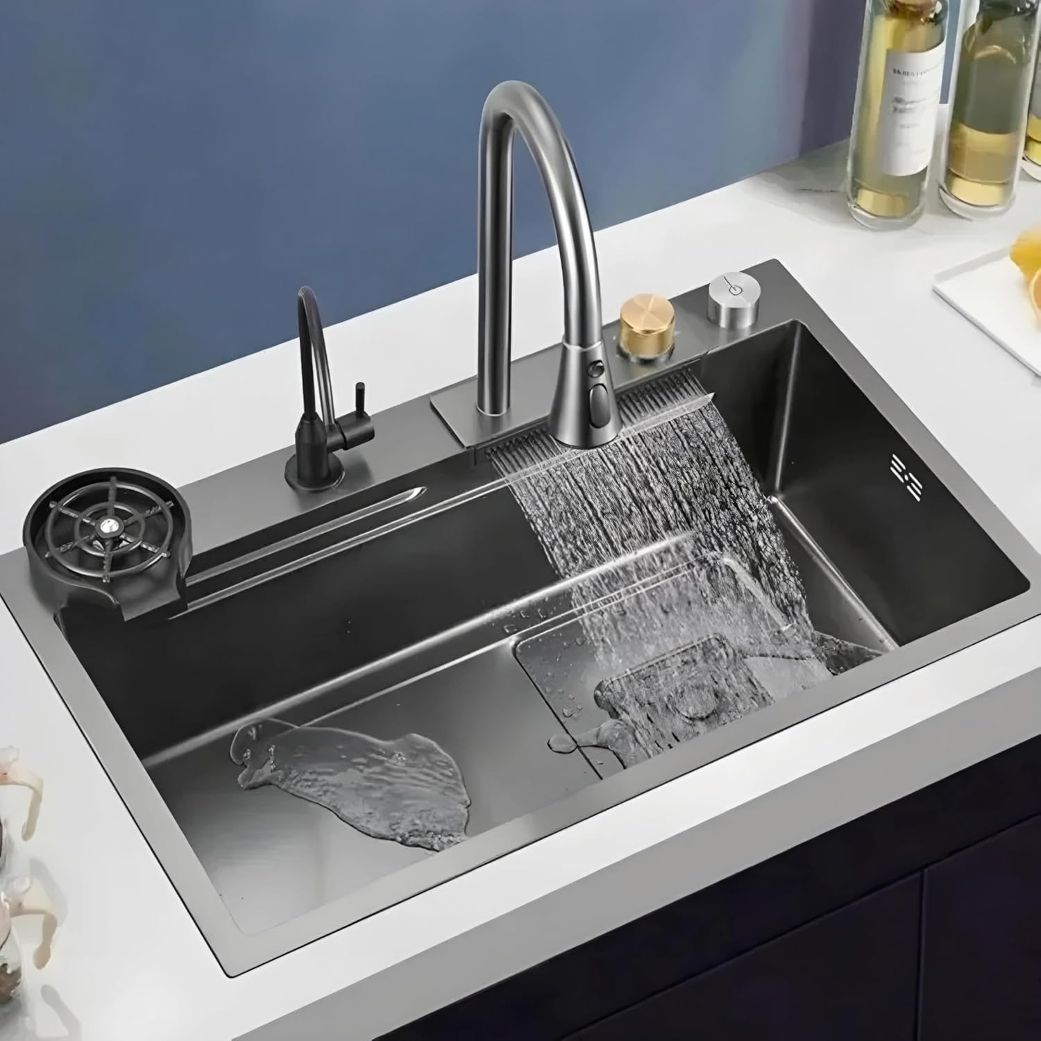 Waterfall Kitchen Sink Set, 304 Stainless Steel, 75x45cm, 9 Pieces, Pull-Out Faucet, Cutting Board, Cup Washer