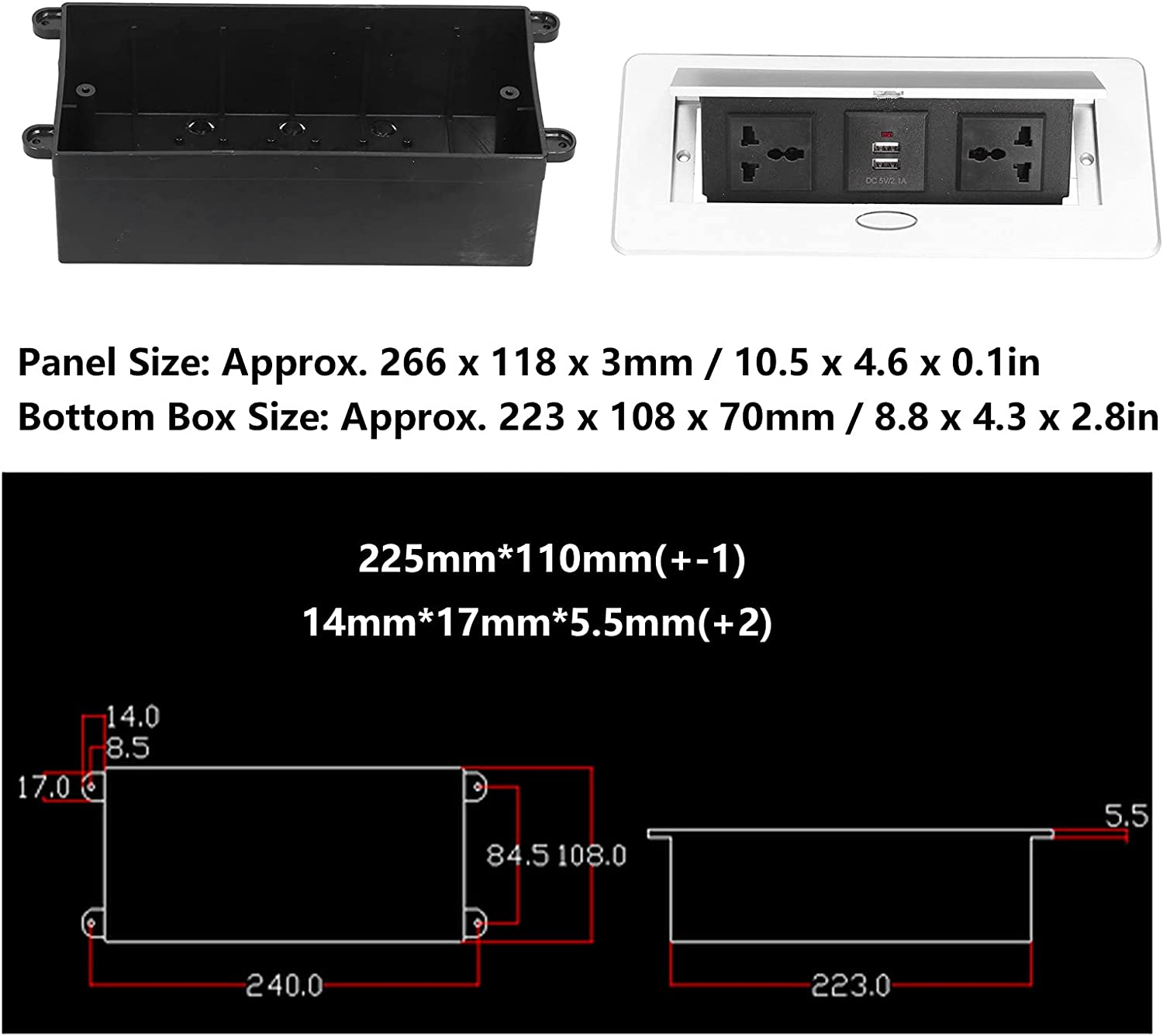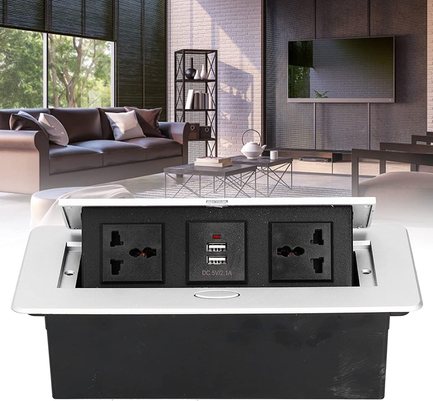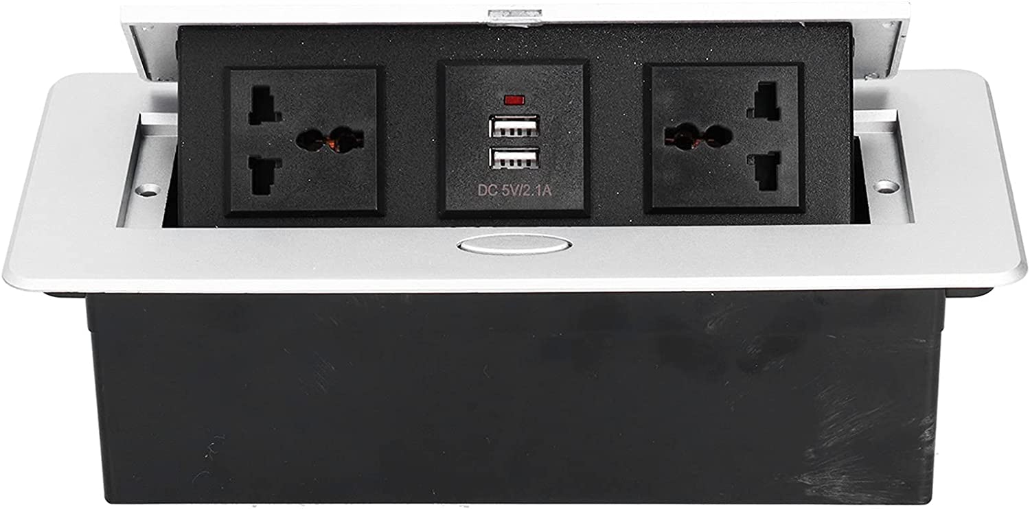 5. Beautiful panel is resistant to scratches and high temperature as well, very durable for long use. Specification: Item Type: Table Pop Up Socket Panel Material: Aluminum Alloy Bottom Box and Functional Parts Material: Flame Retardant PC Rated Voltage: 250v Rated Current: 13A Color: Black USB Port Rated Voltage: DC 5V USB Port Rated Current: 2.1A Protection Grade: IP40 Installation Method: Embedded Usage Scenarios: Office desktop, business office building, residence, factory.