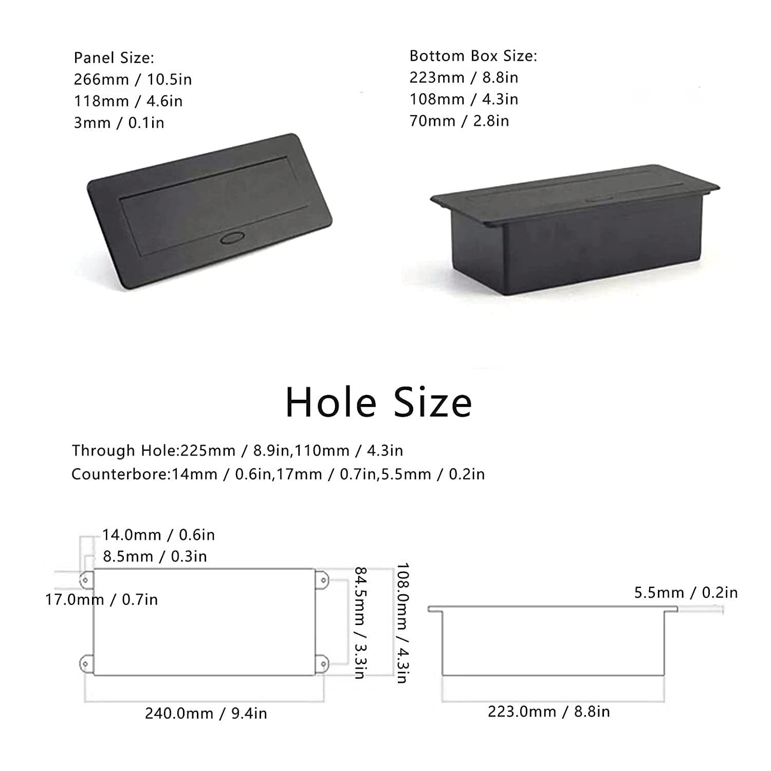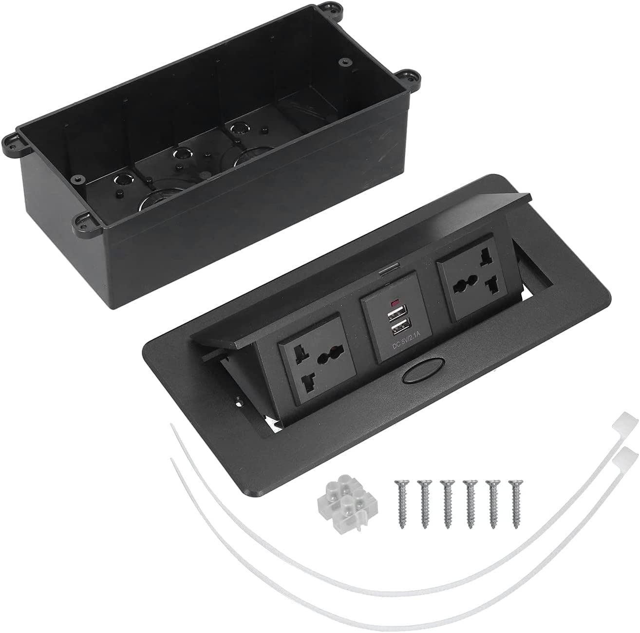Feature: 1. The LED indicator makes it much easier to find the socket in the dark and charge your devices. 2. Pop up design with slow bounce damping enables safe and simple open by pressing one key. 3. Equipped with 3 hole ports and 2 USB ports, you can charge more equipments at the same time. 4. Bottom box works effectively in preventing disconnection and electric leakage, very safe to use. 5. Beautiful panel is resistant to scratches and high temperature as well, very durable for long use. Specification: Item Type: Table Pop Up Socket Panel Material: Aluminium Alloy Bottom Box and Functional Parts Material: Flame Retardant PC Rated Voltage: 250v Rated Current: 13A Colour: Black USB Port Rated Voltage: DC 5V USB Port Rated Current: 2.1A Protection Grade: IP40 Installation Method: Embedded Usage Scenarios: Office desktop, business office building, residence, factory. Package List: 1 x Bottom Box 1 x Socket Panel 1 x Connector 2 x Cable Tie 6 x Mounting Screw Note: 1. Be careful not to get water in during installation, try to keep the desktop socket dry and clean to avoid potential safety hazards when using it in the future. 2. Be sure to connect to ground the wire when installing the desktop socket, so as to better ensure the safety and service life issues. 3. When installing the desktop socket, you must pay attention to the position, and it should not affect the normal use of the desk. It is best to install it in a relatively secret place or a location that is not frequently used. 4. After the desktop socket is installed, be sure to test them one by one to see if they can be used normally. At the same time, pay attention to waterproof and moisture proof measures to avoid affecting future use.
