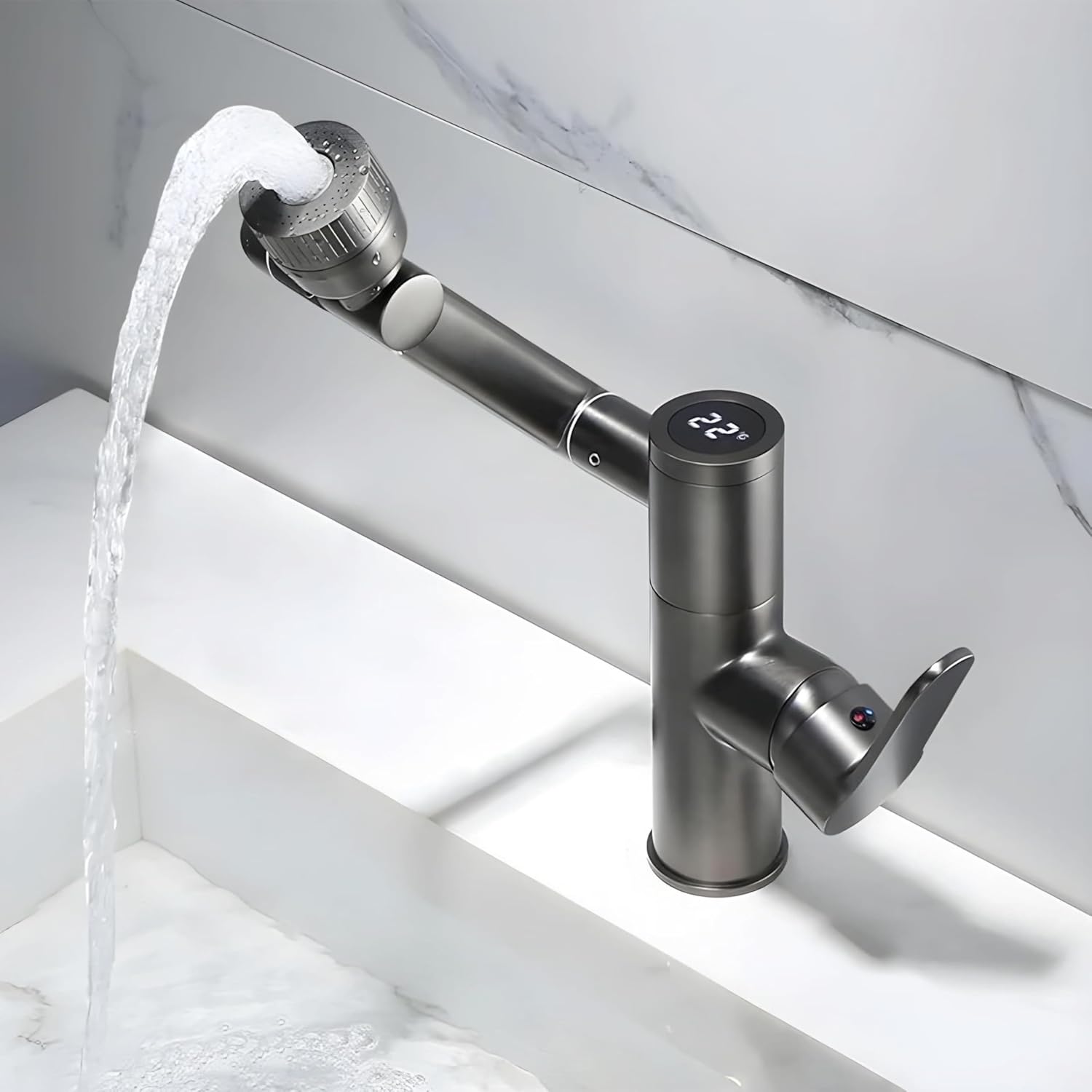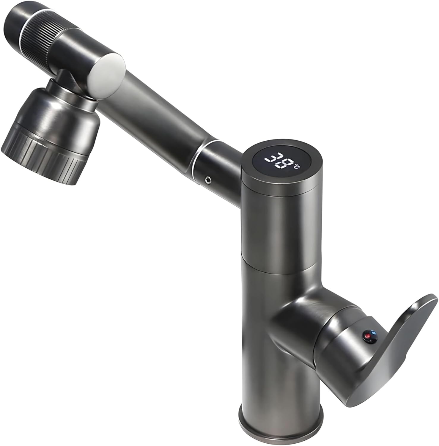 Introducing the Modern Hot and Cold Basin Faucet with Adjustable Temperature and a Single Handle for convenience. The built-in Digital Display allows for precise temperature control. With a sleek black design, enhance the aesthetics of your bathroom. Trust in the ceramic cartridge for durability.