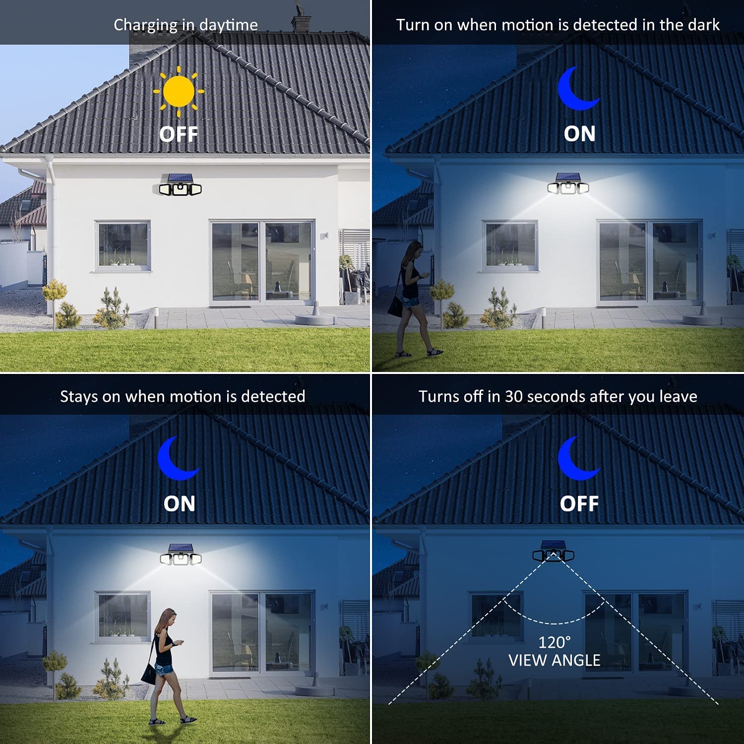 - Wide Lighting Area - With the innovative wide-angle and three heads design, Adjustable heads can move upwards, downwards and horizontally. Up to 270° wide lighting angle and 16-26ft sensing distance, Easy to adjust the light heads, lens hoods and motion sensor to different angles as your requirement. Lighting direction is adjustable with the three flexible light heads, save your trouble to install two extra light. No need for electricity, environment-friendly product.